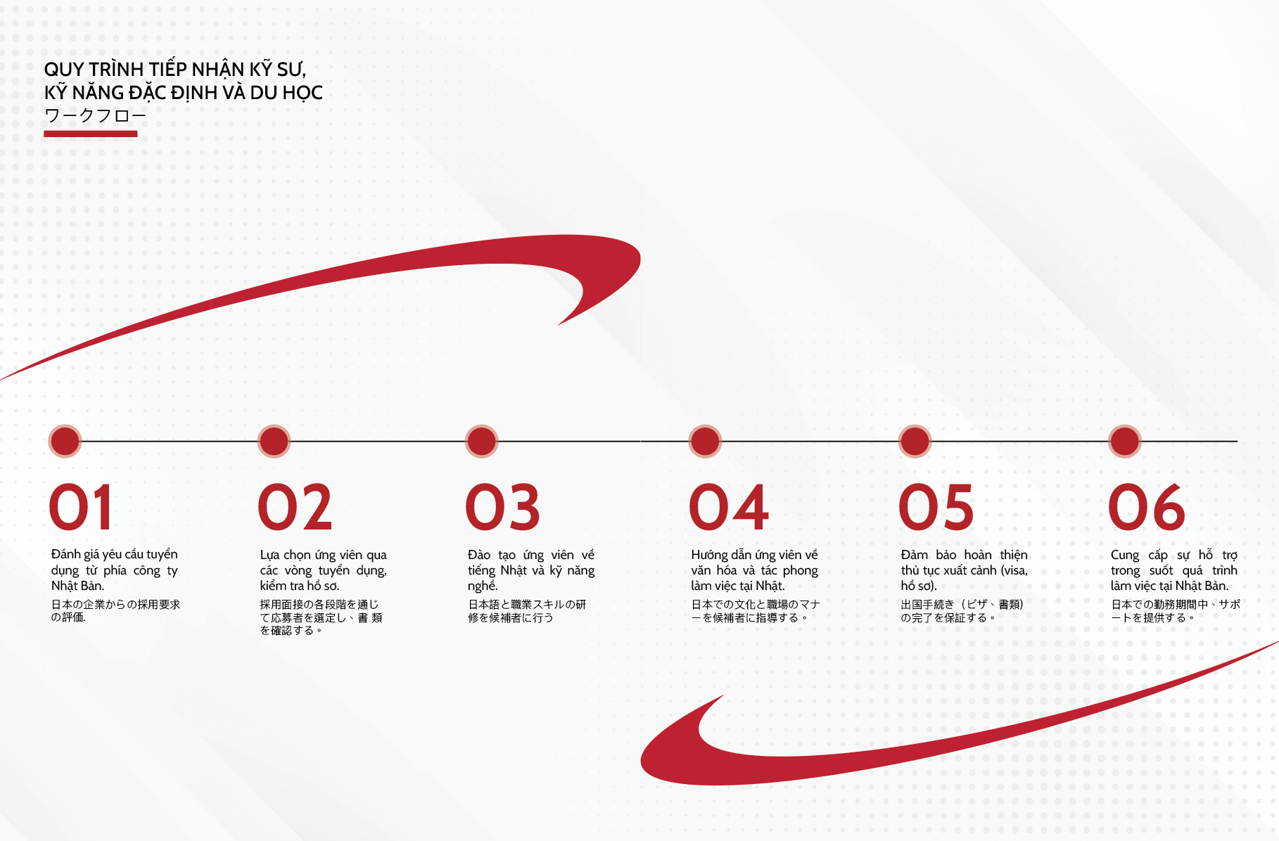 Quy trình chuẩn bị cho ứng viên từ lúc bắt đầu tuyển dụng đến khi xuất cảnh sang Nhật Bản được chia thành các bước rõ ràng và đầy đủ, đảm bảo rằng tất cả ứng viên đều có sự chuẩn bị tốt nhất.